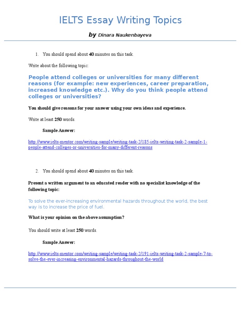 IELTS Writing Task 2 Sample Answer: Leadership IELTS Writing Task 2 Sample Answer Essay: Leadership Essay 2 Many pschologists recommend that the best way to relieve stress is to do nothing at all for a period of time during the day. Do you agree or disagree? IELTS Writing Task 2 Sample Answer: Stress Some think that ambition is a good quality Jul 20, · In writing tasks 2, the candidates need to write an essay of words in 40 minutes as feedback to an argument or viewpoint or a problem. For IELTS academic the tone of the essay must be formal and for the IELTS general training, the essay needs to have an informal tone. The topics of IELTS writing task can be diverse and the question types Apr 19, · IELTS Writing Task 2/ IELTS Essay: You should spend about 40 minutes on this task.. Write about the following topic: People attend colleges or universities for many different reasons (for example, new experiences, career preparation, increased knowledge etc.)
