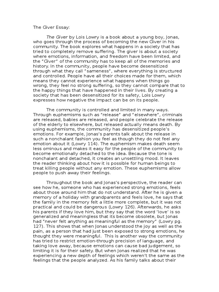 Themes The importance of memory; the relationship between pain and pleasure; the importance of the individual. Ace your assignments with our guide to The Giver! Want study tips sent straight to your inbox? Sign up for our weekly newsletter! Search all of SparkNotes Search Suggestions Use up and down arrows to review and enter to select, essay on the giver by lois lowry.